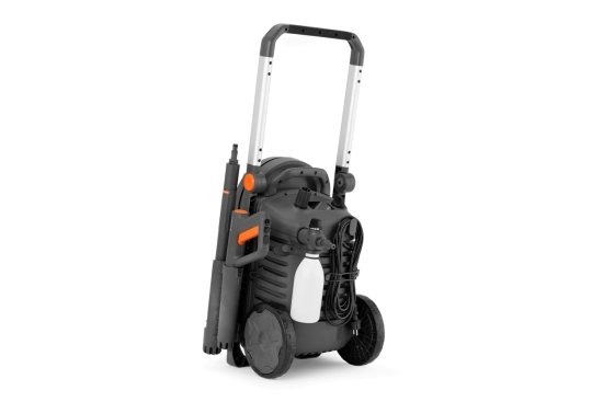 Le PW 370 est compatible avec plusieurs accessoires, et lorsque le travail est terminé, l'enroulement se fait rapidement à l'aide de l'enrouleur de tuyau avec guide de support, ce qui permet un rangement efficace du tuyau. Il est également équipé de grandes roues à bande de roulement souple pour une meilleure traction sur les terrains difficiles, et d'une poignée en aluminium repliable pour réduire l'espace nécessaire au stockage.